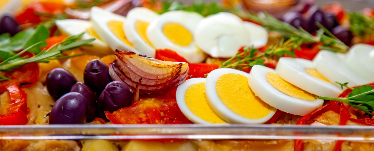Deixe para colocar ovos e azeitonas no final, para aquecer sem perder textura. Se entrar muito cedo, o ovo tende a ressecar, e a azeitona pode amargar com tempo excessivo de forno.